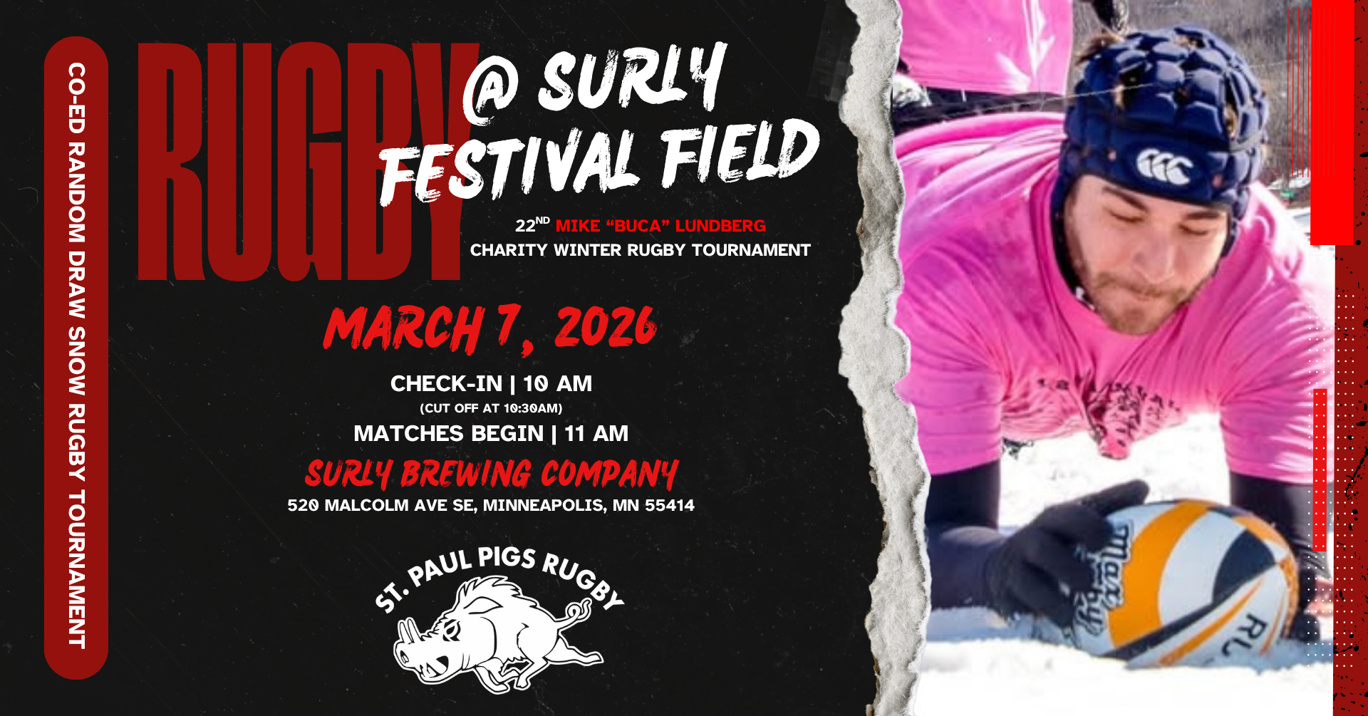 New location for Buca 2026! The 22nd annual Mike "Buca" Lundberg Memorial Rugby Tournament will be held March 7th, 2026 at Surly Festival Field! For the first time ever, we are moving our snow rugby tournament to the Twin Cities. 520 Malcolm Ave SE, Minneapolis, MN 55414.tribe-events-before-html{display:none} HISTORY In 2004, the Mike Lundberg Memorial Tournament […]